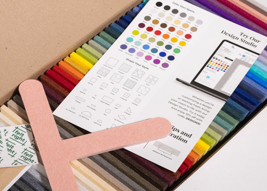 From ordering to installing your Felt Right tiles, we strive to make the process as easy as possible. Check out our installation guide for simple instructions, or explore our sample kit, which includes all 42 colors and adhesive tabs to help you create your perfect design.