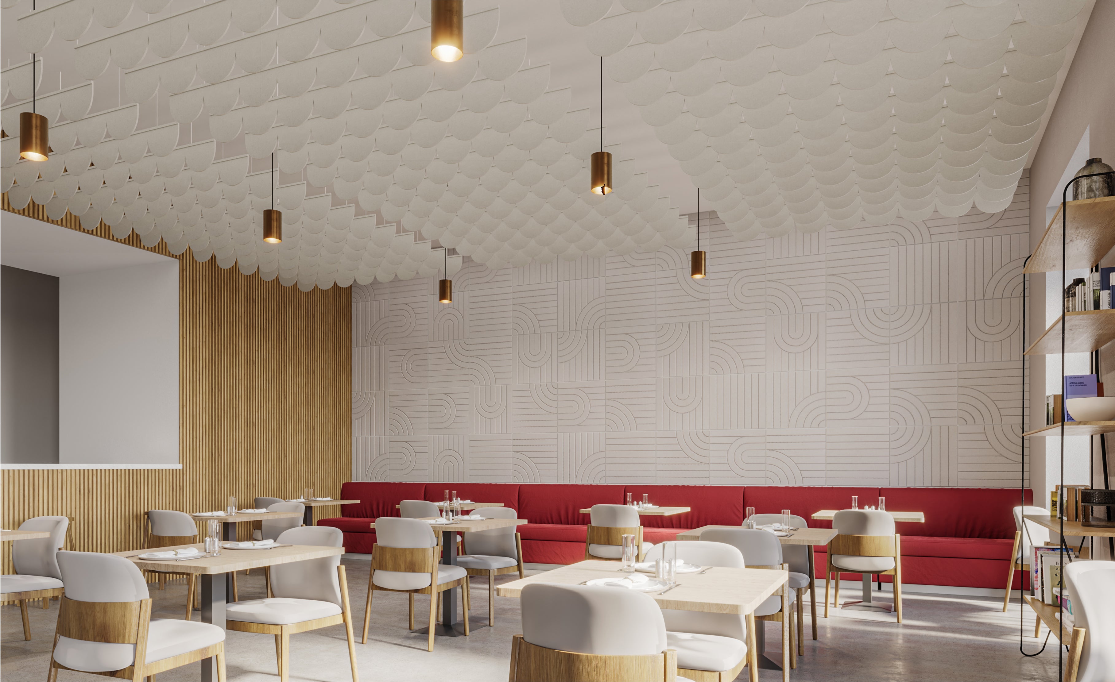 This bustling coffee shop in Park City, Utah used Felt Right's acoustic beam baffles to trap excess noise and echo. Customers instantly noticed the calmer atmosphere and refined design elements.