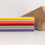 Each Felt Right tile is made from high-density, engineered PET felt that has a warm, wool-like appearance but is also very durable and wear-resistant! Our tiles come from 50% recycled single-use plastic that has been broken down into fibers and sterilized without harmful chemicals. These fibers are dyed and felted together into sheets which we then cut down into different shapes. Each tile is 9mm and has precision-cut, chamfered edges.